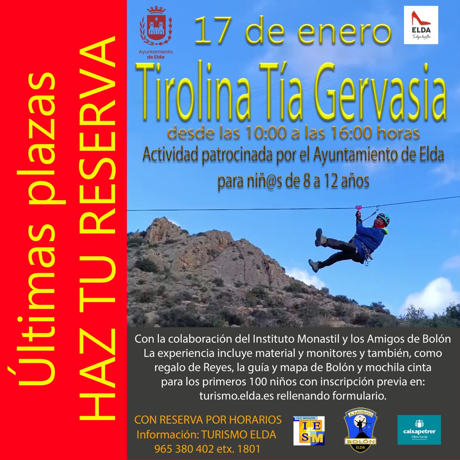 La Tirolina de la Tía Gervasia es una tirolina infantil o familiar y tiene un ‘vuelo’ de una duración aproximada de 18 segundos, suficiente para vivir una experiencia emocionante pero adaptada a los más pequeños. Es la segunda tirolina instalada en el Monte Bolón, junto a la ya existente de Vicente Soler, consolidando este espacio como un referente para este tipo de actividades.